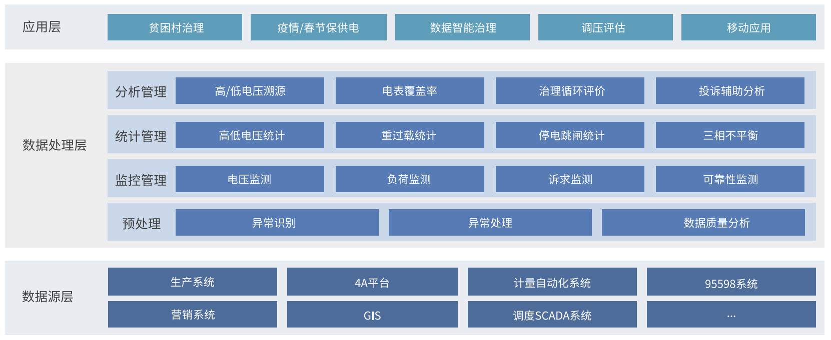 生產(chǎn)監(jiān)測(cè)解決方案是開展電壓質(zhì)量管理的監(jiān)控指揮系統(tǒng),系統(tǒng)融合營(yíng)銷、客服、生產(chǎn)、GIS、計(jì)量、調(diào)度等系統(tǒng)數(shù)據(jù),完成千萬(wàn)級(jí)測(cè)點(diǎn)數(shù)據(jù)的快速的清洗、計(jì)算、分析和應(yīng)用,建立電能質(zhì)量“采集-監(jiān)測(cè)-分析-治理-評(píng)價(jià)”的閉環(huán)管控機(jī)制,構(gòu)建“站-線-變-戶”一體化數(shù)據(jù)模型,擴(kuò)大居民用戶電壓監(jiān)測(cè)范圍,挖掘智能電表數(shù)據(jù)應(yīng)用場(chǎng)景,綜合利用智能電表、電壓監(jiān)測(cè)儀、負(fù)控終端等多源數(shù)據(jù),分析可能存在或潛在高低電壓、重過(guò)載問(wèn)題的變電站、母線、中壓線路和配電臺(tái)區(qū),梳理問(wèn)題清單,對(duì)問(wèn)題進(jìn)行溯源,輔助精準(zhǔn)運(yùn)維。