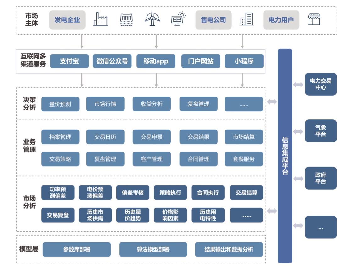 以電力市場化改革為方向指引,面向發(fā)電企業(yè)、售電公司、電力用戶等市場主體提供電力交易咨詢服務(wù)、市場交易數(shù)據(jù)分析、成本 及競價(jià)空間分析、量價(jià)預(yù)測服務(wù)(新能源功率預(yù)測、中長期/現(xiàn)貨電價(jià)預(yù)測、用電量/負(fù)荷預(yù)測等)、電力交易競價(jià)策略、交易風(fēng)險(xiǎn)管理、 交易申報(bào)管理、交易復(fù)盤分析等全流程的技術(shù)服務(wù)及工具類/平臺(tái)類的產(chǎn)品。